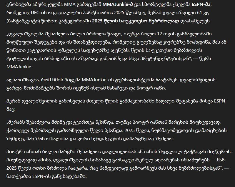 Renowned American MMA outlet MMAJunkie and sports network ESPN, an official partner of the UFC until 2025, have named Merab Dvalishvili the Best Fighter of 2025 in the 61 kg (Bantamweight) division.